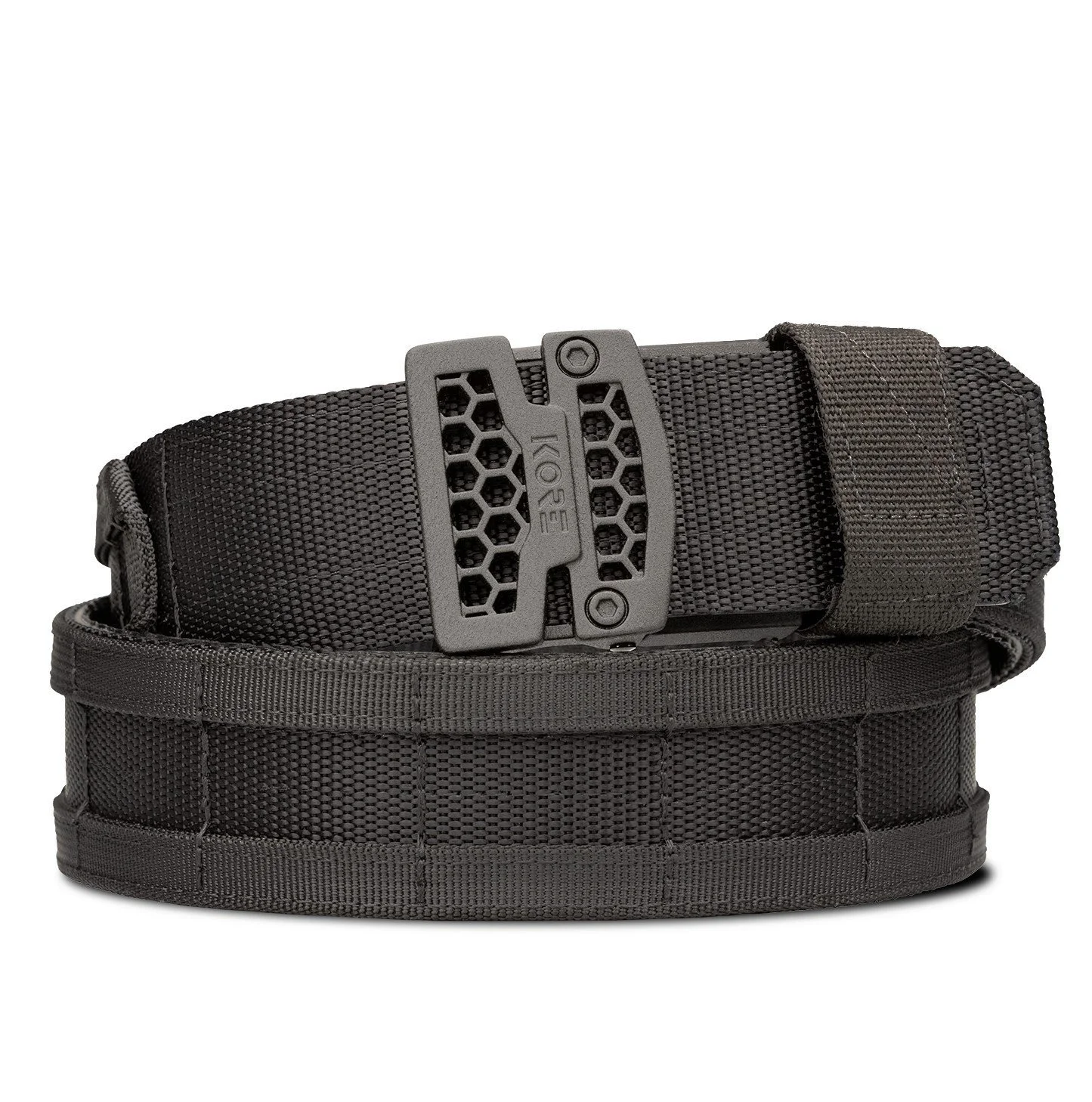 KORE Gürtelschnallen sind speziell für Waffengurte konzipiert. Die Schnallen bestehen entweder aus hochwertiger Zinklegierung mit galvanisierter Schiefer- oder schwarzer Pulverbeschichtung oder aus massivem Edelstahl (alle enthalten Nickel). Der Schnallenmechanismus verfügt über ein von KORE entworfenes und patentiertes, federbelastetes System, das langlebig, zuverlässig und nicht klebend ist.