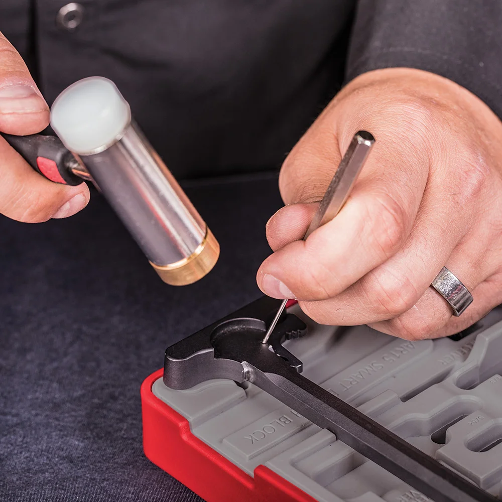 ARMORER’S AR15 PIN PUNCH SET WITH PIN ALIGNMENT TOOL - Gunsmithing hammers and punches are core tools needed to modify or disassemble firearms. Most sets available today are generic repurposed hardware sets. Accu-Punch Hammer & Punch sets are designed from the ground up to work better on guns. The hammer features an ergonomic grip and perfectly balanced weight to give both precise control for tapping tiny pins and optimal force for those that need a little “persuasion”. Our punches are made of hardened steel with a nickle-plating to resist corrosion as well as hex-shaped handles and rubber O-rings for precise control. Our proprietary Pin Alignment Tool makes aligning and starting tiny pins both easy and accurate. These professional grade gunsmithing sets are organized in an uber-tough stand-up case.