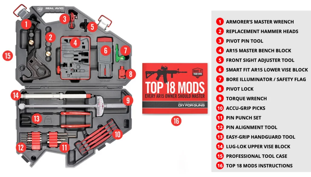 Mit diesem Werkzeugset können Sie alles in Angriff nehmen, vom Bau Ihrer eigenen Waffe auf AR15-Basis bis hin zur Anpassung oder Modifizierung einer bestehenden Waffe. Jedes Tool ist perfekt auf die AR15 abgestimmt, passgenau und aus ausgezeichneten Materialien gefertigt. Alle Teile sind in einem hochwertigen Koffer untergebracht und mit einer Schritt-für-Schritt-Anleitung ausgestattet. Somit können Sie, unabhängig von Ihrem Erfahrungsstand, jede Arbeit am AR15 ausführen