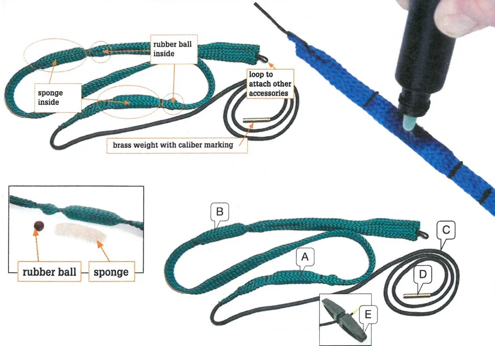 Die 4 Reinigungselemente sind jeweils in der Reihenfolge Schwamm-Kugel im vorderen und hinteren Teil der Schnur angeordnet, so dass der Anwender nach jeder Anwendung immer einen praktisch flüssigkeitsfreien Lauf vorfindet, der ohne weitere Schritte schussfertig ist. Hintergrund der Weiterentwicklung der Reinigungsschnur ist die Erfahrung, dass eigentlich nur Reinigungsflüssigkeiten Schmauch neutralisieren, Tombak- und andere Laufablagerungen lösen und den Lauf konservieren können. Weiter möchten nicht alle Schützen bei jedem Reinigungsprozess eine abrasive Bürste einsetzen.