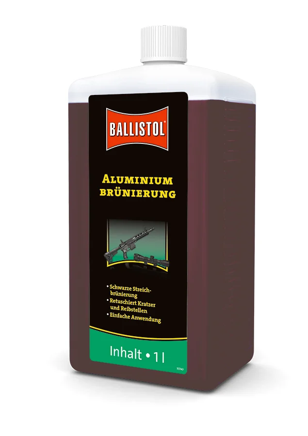 Die Ballistol Aluminium-Brünierung zur Oberflächenveredelung ist die erste für den Endanwender zugelassene Aluminium-Brünierung und somit nicht ausschliesslich für den gewerblichen Nutzer geeignet. Die auch für Laien einfach anzuwendende schwarze Streichbrünierung für Aluminiumlegierungen ist dabei abriebfest und dauerhaft. Sie eignet sich somit ideal zum Ausbessern von Kratzern und Reibstellen, aber auch zur Neubrünierung beispielsweise für die Zielfernrohrmontage, den Handschutz bei halbautomatischen Waffen oder sogar für komplette kleinere Bauteile. Die Brünierung besticht durch ihre sehr leichte Anwendung. Zu beachten ist lediglich, Oberflächen vor der Brünierung zu entfetten. Gegebenenfalls kann die Oberfläche auch leicht angeschliffen werden. Brünierung gleichmässig auftragen und 20-30 Sekunden einwirken lassen. Anschliessend trockentupfen und erneut auftragen. Nach 3-4 Wiederholungen mit Wasser abspülen und abschliessend konservieren. Die Brünierung ist sehr ergiebig. Für einen Quadratmeter werden circa 100ml benötigt.