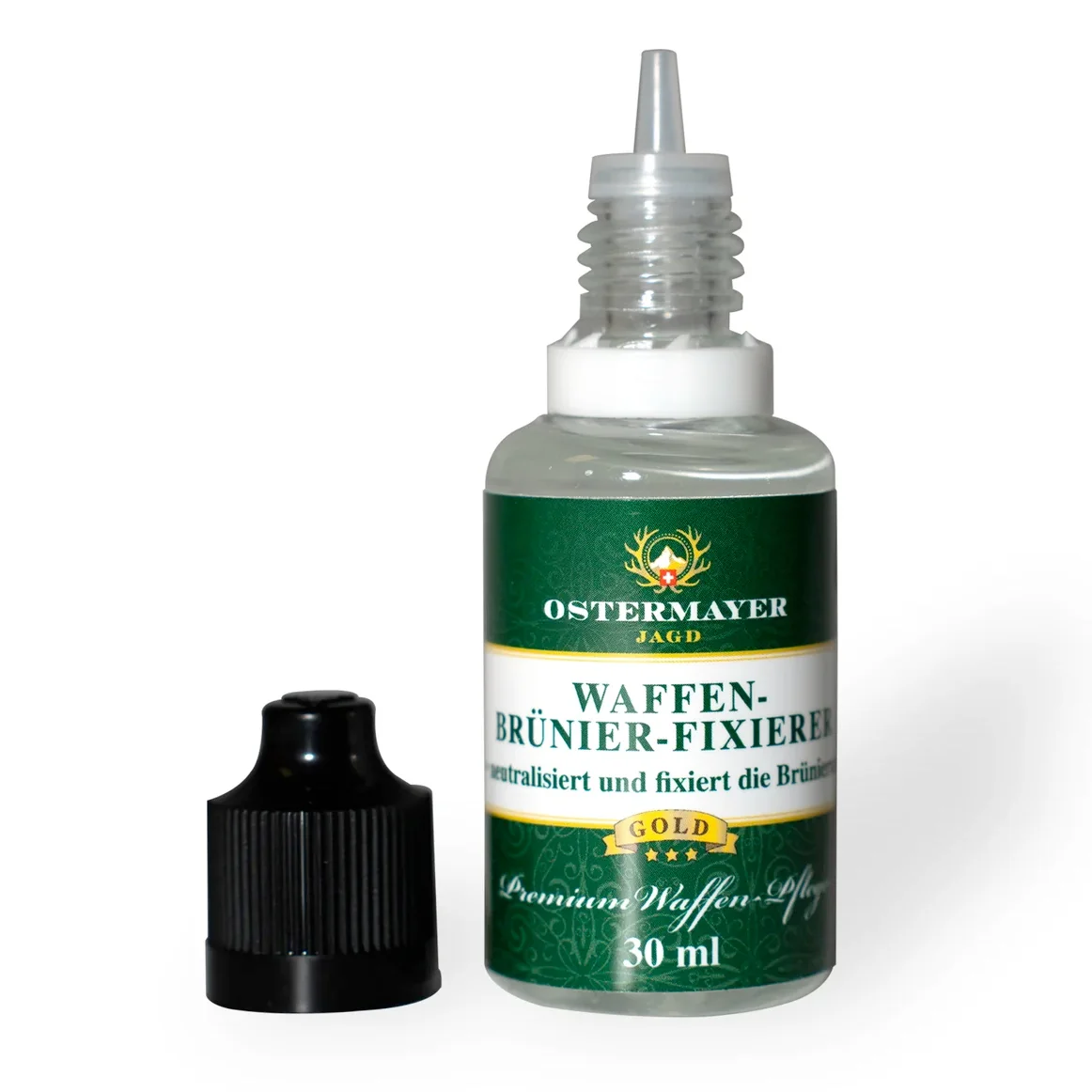 Nach etwa 2-8 Minuten ist der Bereich brüniert. Bei Bedarf den Bereich mit Wasser spülen und erneut brünieren bis gewünschte Schwärzung erreicht ist. Danach mit Ostermayer Brünier-Fixierer die Brünierung fixieren und gegen Korrosion schützen. Bei Brünierung von ganzen Waffenteilen oder rostigen Waffen empfehlen wir die Waffenteile vorher in dem Ostermayer Jagd Entroster einzulegen um diese zu entrosten und etwaige Brünierreste zu entfernen. Anschliessend sollten die Teile möglichst mit Stahlwolle poliert und mit Wasser gespült werden um ein möglichst gleichmässiges Ergebnis zu erreichen, danach wie oben beschrieben brünieren. 35ml reichen für etwa 8 Gewehrläufe.