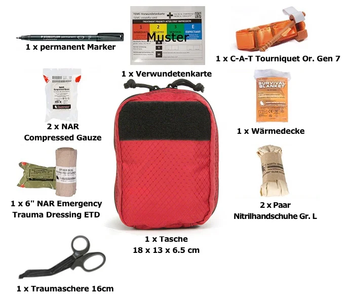 Entwickelt, um wichtige Utensilien bereitzustellen, mit denen die Einsatzkräfte sofort Massnahmen ergreifen können, um lebensbedrohliche Blutungen zu stoppen. Bietet intuitive und benutzerfreundliche Tools, die nachweislich Leben retten. Verpackt in einer kompakten, roten Nylontasche