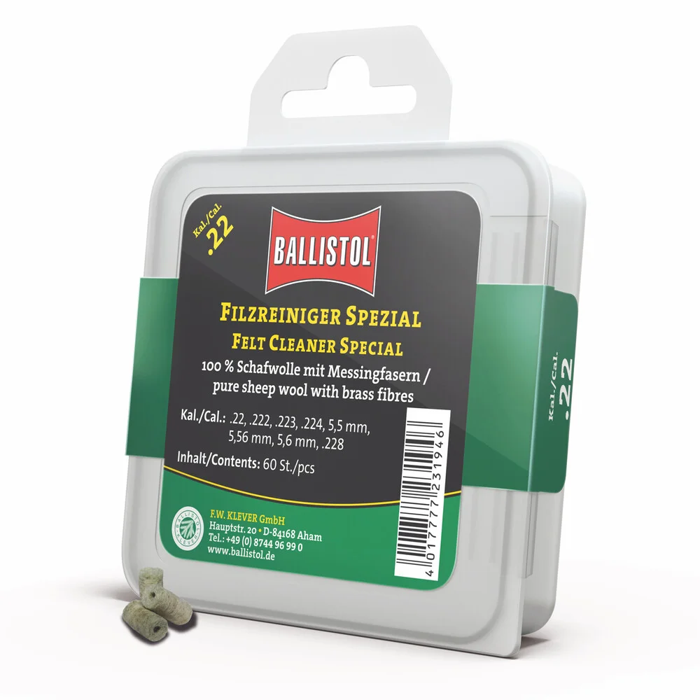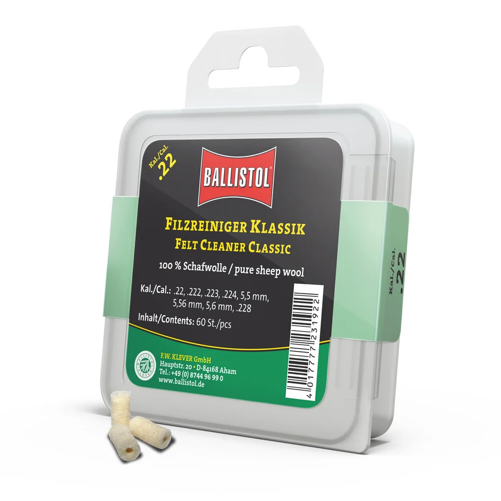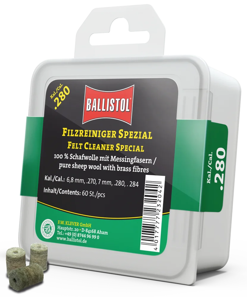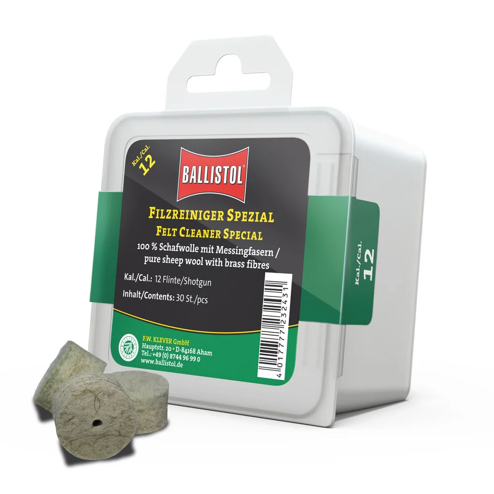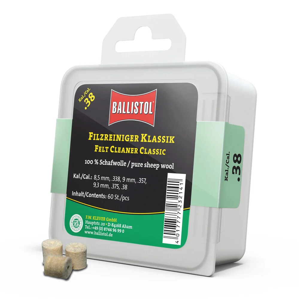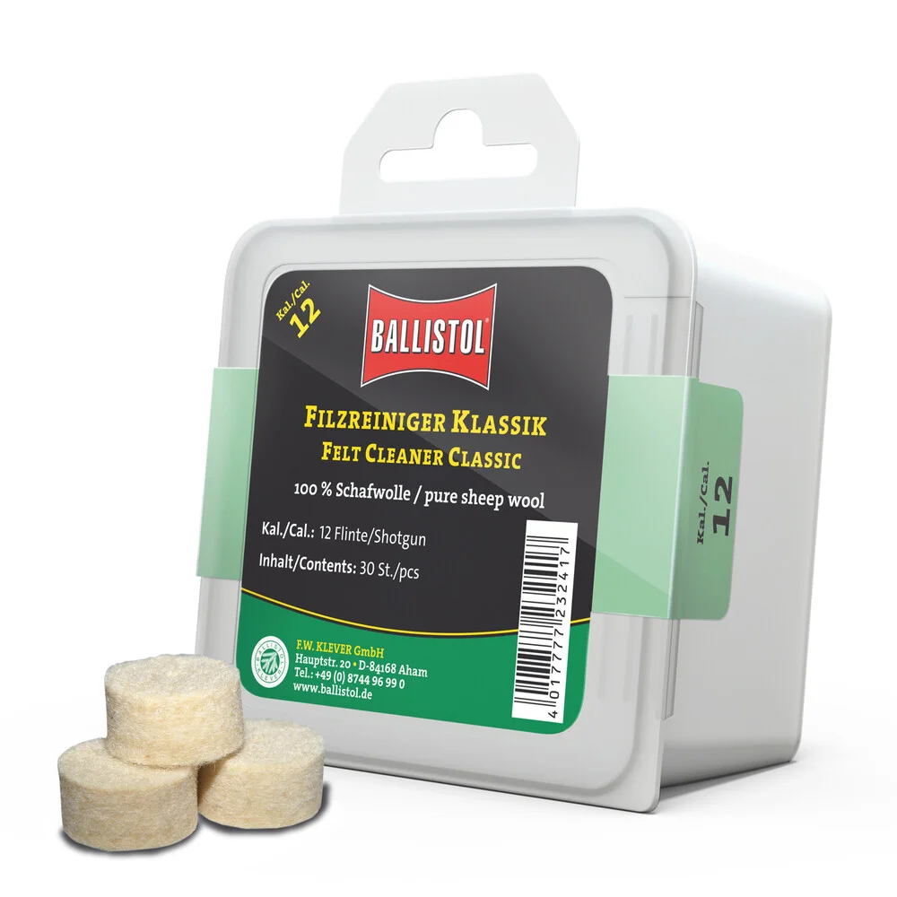 KLASSIK & SPEZIAL - so heissen die beiden brandneuen Filzereiniger von Ballistol. Die Filze sind optimiert auf das jeweilige Kaliber und passgenau gefertigt. Erhältlich als Klassik (100% Schafwolle) und Spezial (Schafwolle + Messingfasern). Die Ballistol Filze bieten eine Alternative zu Metallbürsten und Patches, werden aber idealerweise zusammen mit diesen eingesetzt. Diese Filze können gröbere aber auch sehr feine Schmutzpartikel aufnehmen, festhalten und aus dem Lauf befördern.