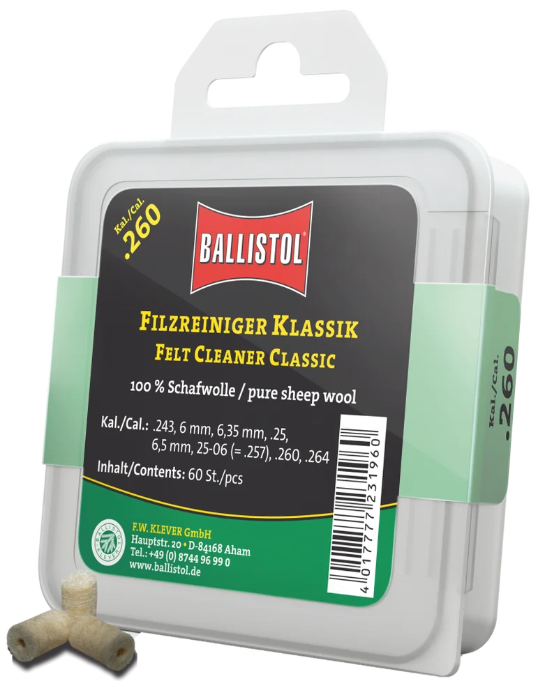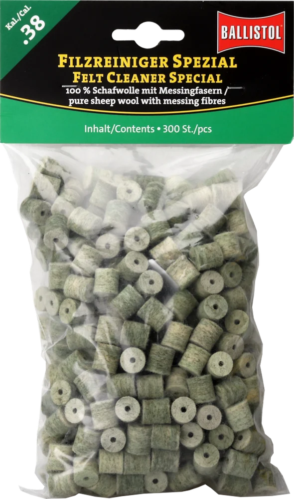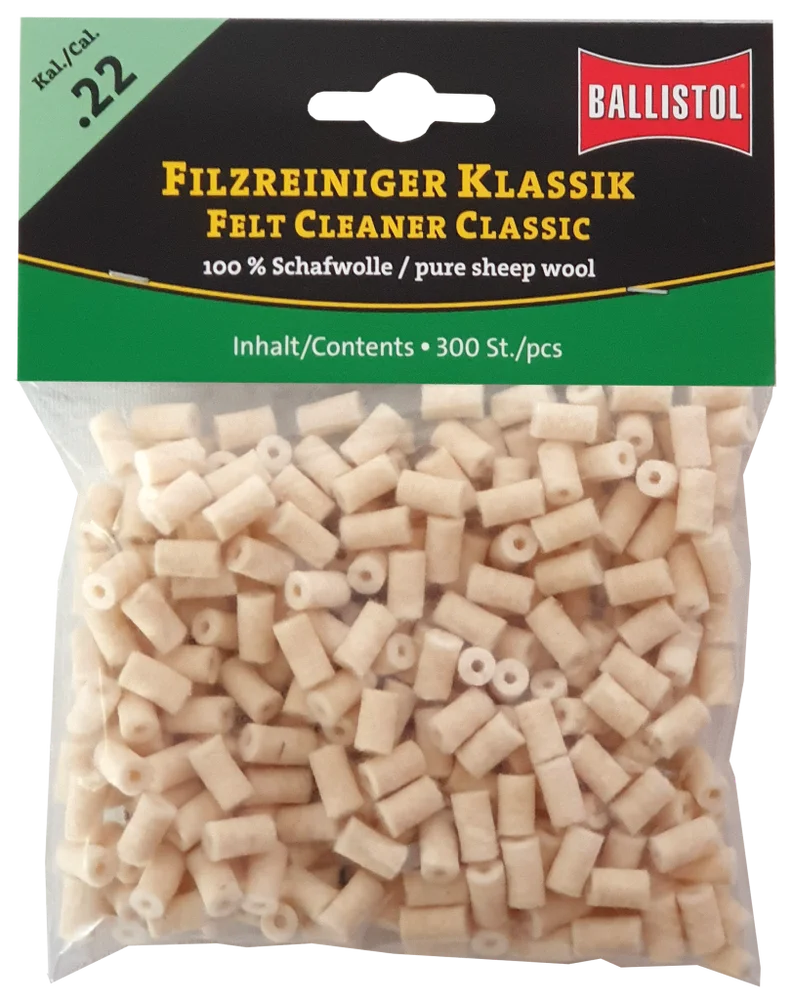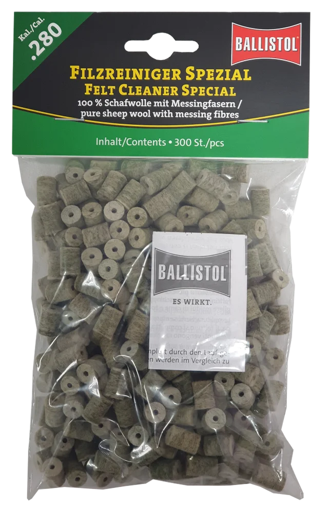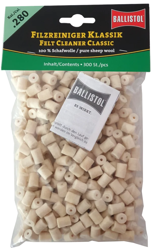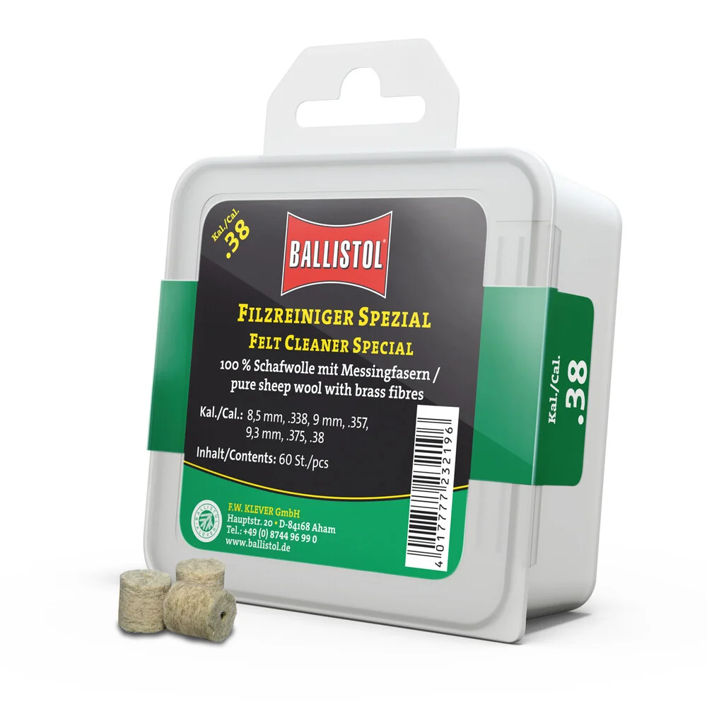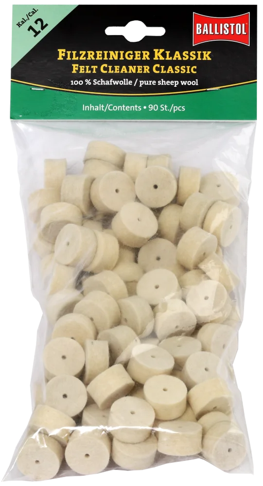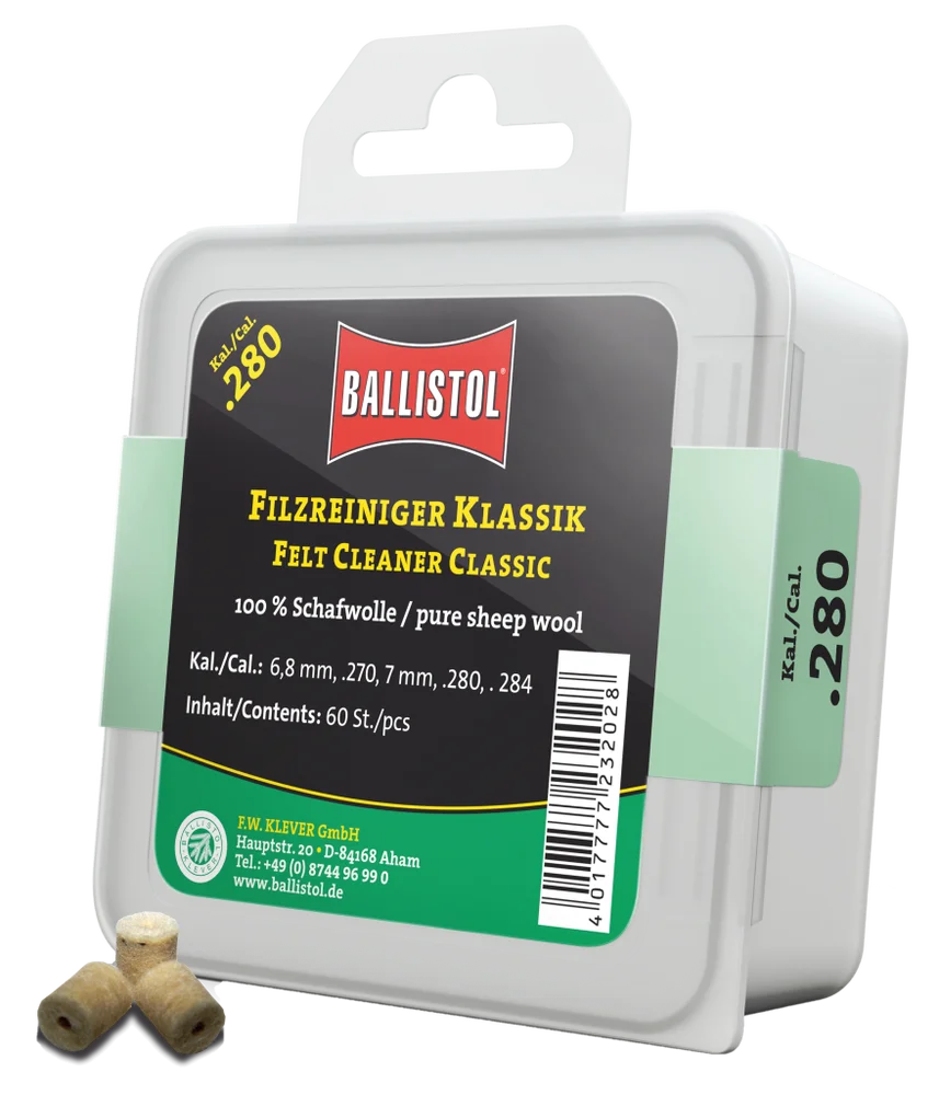 KLASSIK & SPEZIAL - so heissen die beiden brandneuen Filzereiniger von Ballistol. Die Filze sind optimiert auf das jeweilige Kaliber und passgenau gefertigt. Erhältlich als Klassik (100% Schafwolle) und Spezial (Schafwolle + Messingfasern). Die Ballistol Filze bieten eine Alternative zu Metallbürsten und Patches, werden aber idealerweise zusammen mit diesen eingesetzt. Diese Filze können gröbere aber auch sehr feine Schmutzpartikel aufnehmen, festhalten und aus dem Lauf befördern.