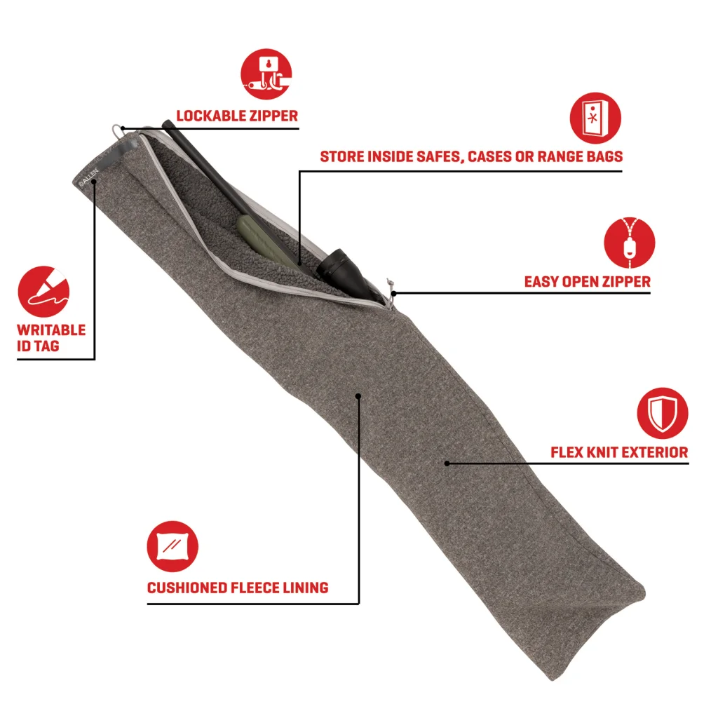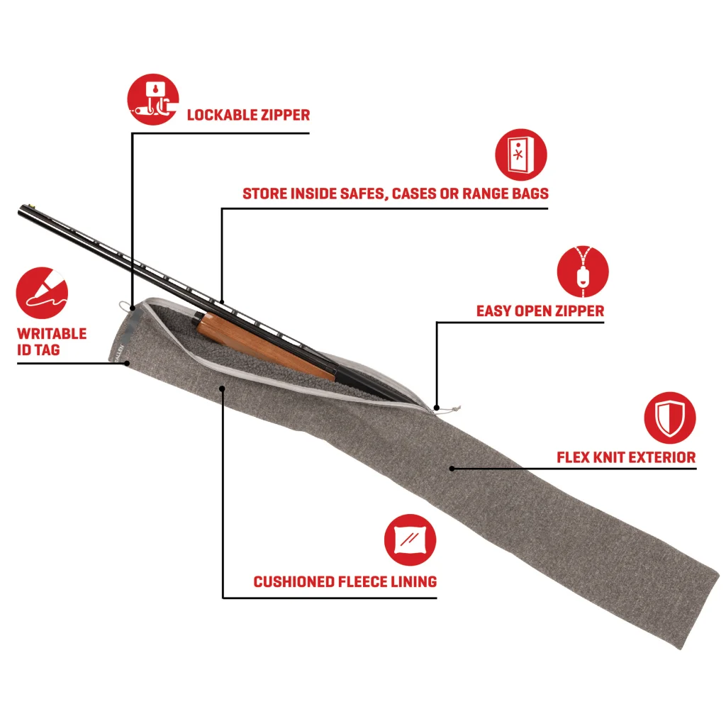 Gestrickter und elastischer Langwaffenstrumpf mit Kordelzug und beschriftbarer Etikette. Perfekter Schutz im Waffenschrank und auf dem Transportweg. Der Gun Sock ist Silikonbehandelt, Stretch und bietet den perfekten Langzeitschutz. Länge 132cm - mit Etikette zur Beschriftung