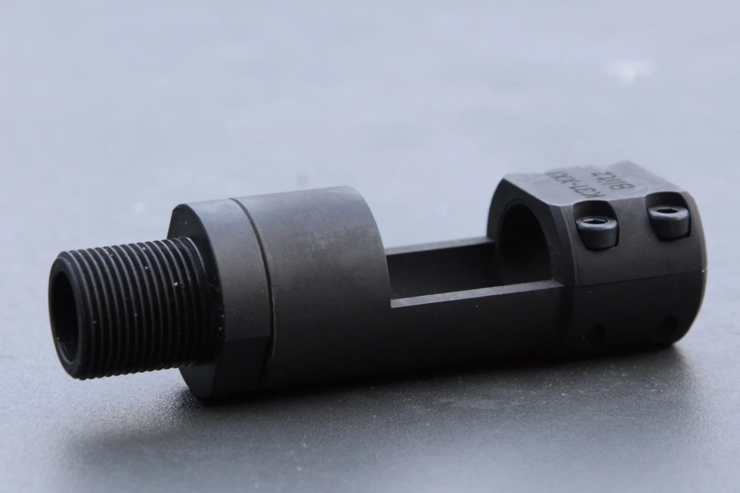 Der Adapter kann auch einzeln erworben werden und ermöglicht die Montage von anderem Zubehör mit 5/8-24" Gewinde. Bei der Montage langer Zubehörteile ist es absolut notwendig, eine visuelle Kontrolle durchzuführen, die vom Patronenlager her durch das Gewehrt zielt. Verwenden Sie die Waffe nicht, wenn das Zubehör nicht 100% auf einer Linie mit dem Lauf ist.