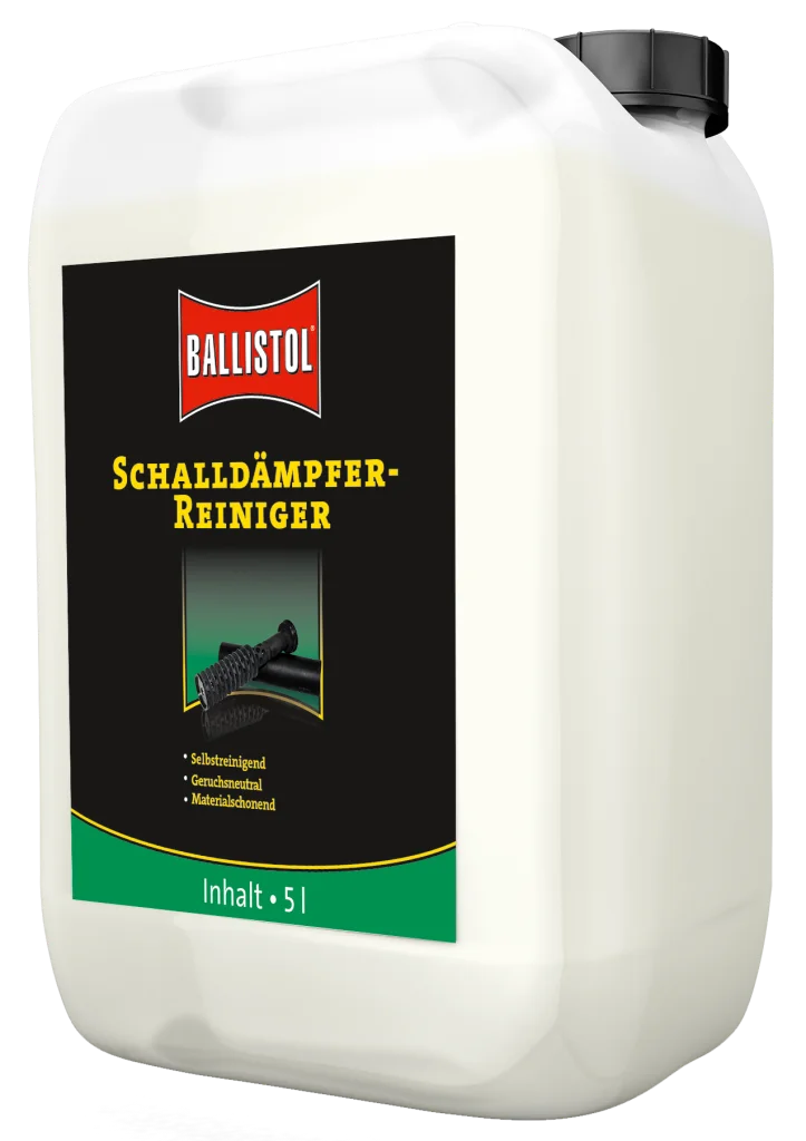 Schalldämpfer auf einer Seite verschliessen und vollständig auffüllen. Den Reiniger mindestens 2 Stunden im Schalldämpfer belassen. Alle Verbrennungsrückstände werden selbständig gelöst. Bei Schalldämpfer mit besonders hoher Schussbelastung den Reiniger auf ca. 40°C erwärmen und die Einwirkzeit auf mindestens 4 Stunden erhöhen. Anschliessend den Reiniger entfernen. Um restliche Verschmutzungen zu lösen, Dämpfer zur Hälfte mit klarem Wasser auffüllen, zweite Öffnung verschliessen und kräftig schütteln. Diesen Spülvorgang solange wiederholen, bis das Wasser keine Russpartikel mehr enthält. Sollte der Schalldämpfer baubedingt nicht mit Stopfen verschliessbar ein, so kann dieser komplett im Reiniger eingelegt werden. Aus für zerlegbare Schalldämpfer geeignet, verschmutzte Teile einlegen und nach der Einwirkzeit mit Pinsel und Wasser reinigen. Oberflächen (Beschichtungen und Lackierungen) vor der Anwendung auf Verträglichkeit prüfen.