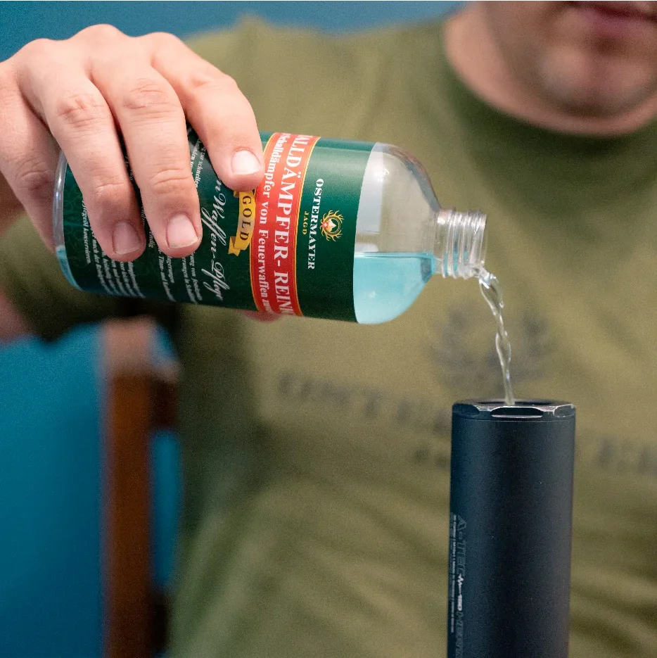 Schalldämpfer einseitig verschliessen, mit Ostermayer Schalldämpfer-Reiniger füllen und ca. 1-2h einwirken lassen. Anschliessend die Hälfte des Reinigers ausgiessen, den Dämpfer mehrmals schütteln und gründlich mit klarem Wasser ausspülen. Danach vollständig trocknen lassen. Zerlegbare Dämpfer zerlegen und für 1 bis 2 Stunden in der Reinigungslösung einlegen