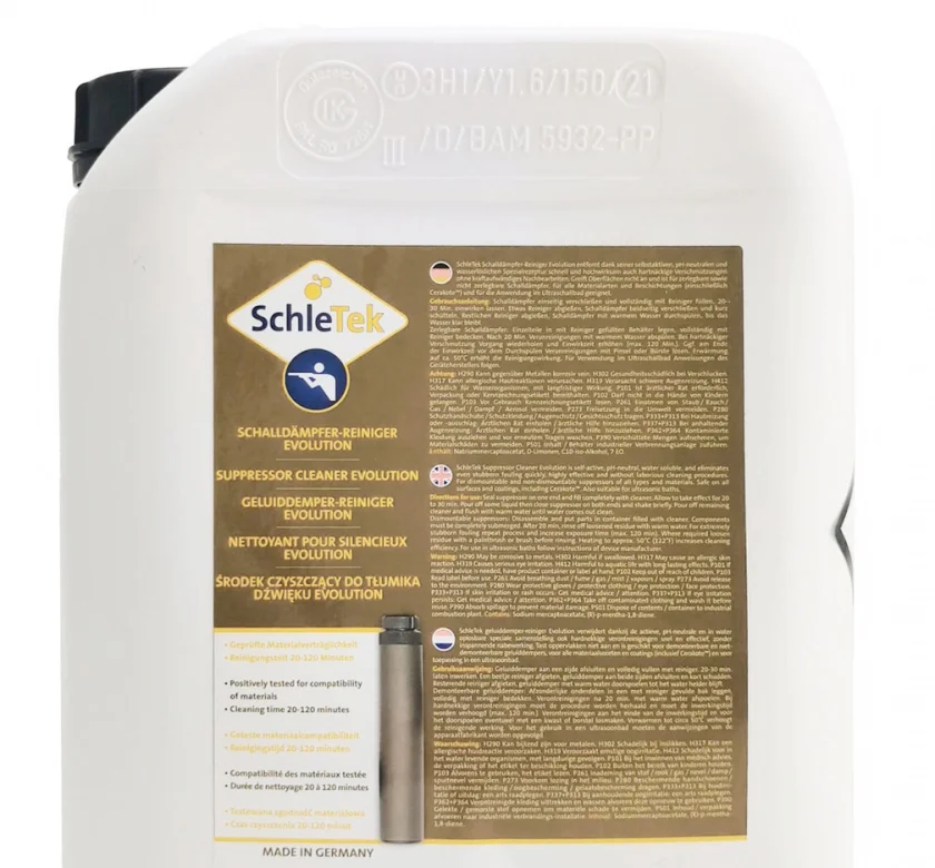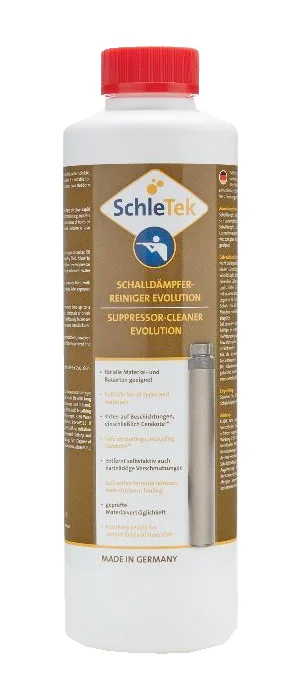 SchleTek Schalldämpfer-Reiniger Evolution ist ein selbstaktiver, pH-neutraler und wasserlöslicher Reiniger, der dank seiner Spezialrezeptur die Oberflächen nicht angreift und für alle Materialarten und Beschichtungen, einschliesslich Cerakote™ geeignet ist. Er entfernt innerhalb kurzer Zeit auch hartnäckige Verschmutzungen ohne zusätzliches kraftaufwändiges Nachbearbeiten. Schalldämpfer aller Bau- und Materialarten wie auch beschichtete Schalldämpfer lassen sich unkompliziert, schnell und hochwirksam reinigen.